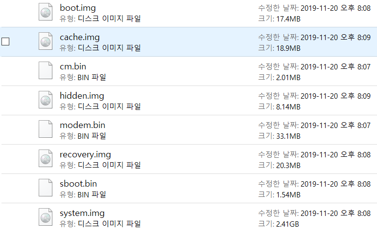 다운로드된 파일의 압축을 풀명 =꽤 긴 파일명으로 되어있고 확장자는 tar.md5 인데, 이것을 개별 파일로 푸는 것이 필요하다. 7z 프로그램을 다운로드 받아서(www.7-zip.org) 풀었다. 압축을 풀면 다양한 파일이 나오는데, 거기서 사용할 파일은 boot.img와 recovery.img 파일이다. (system.img 파일은 사용할 일이 없는데, 이것까지 포함해서 다운 받을수 밖에 없어서 너무 오래 걸렸다.)