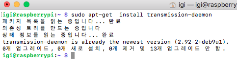 1) 명령어: sudo apt-get install transmission-daemon 실행