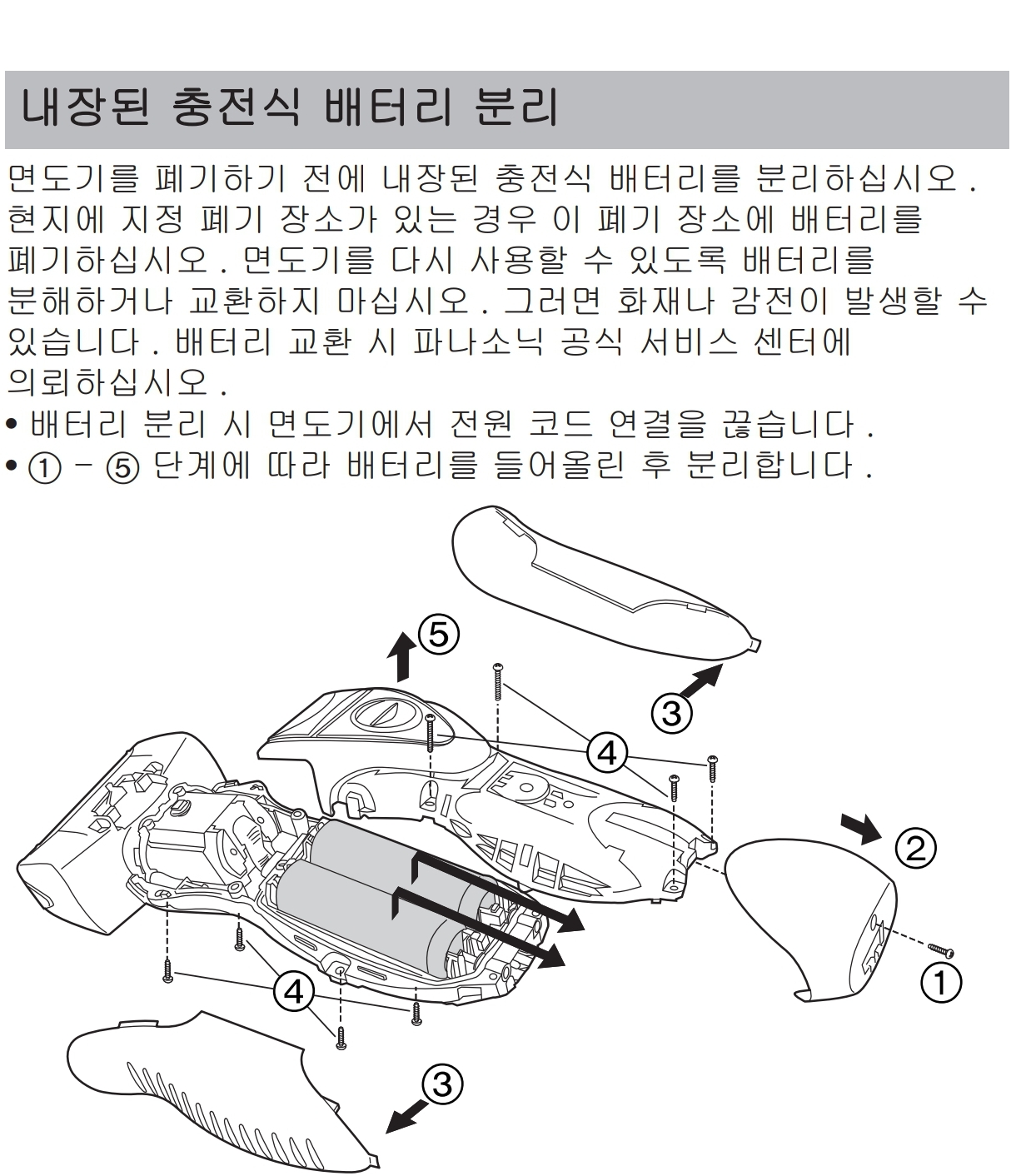 메뉴얼에는 면도기를 폐기할 때 배터리를 분해해서 버리라고 분해하는 방법이 안내되어 있다.
