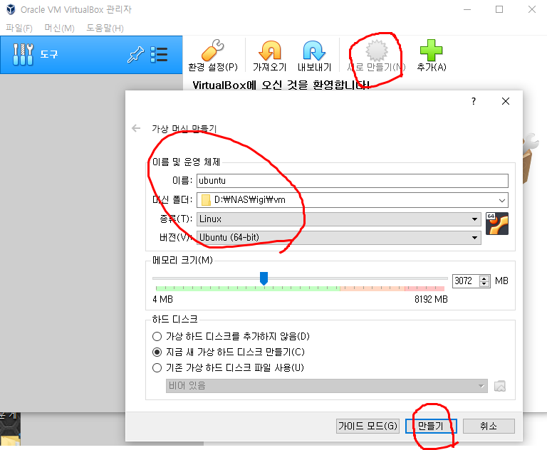 이제는 우분투를 설치해보자. virtualbox에서 새로 만들기 버튼을 누르고, 명칭을 ubuntu로 입력하고 VM이미지가 저장될 폴더를 선택한 후 만들기 버튼을 선택한다. 설명을 스킵하는 것은 긍정적인 선택만 하면 된다.